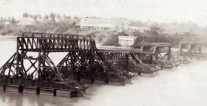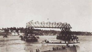 The new bridge needed 4,000 tons of steel and more than a million rivets. It was 1,300 feet long (the longest pontoon bridge in the world, it was claimed) and had 14 spans, the pontoons of which were retained in position by massive chains and 32 anchors varying in weight from 2-½ to four tons and laid to a depth of 180 feet. The deck was thick wooden planks. Who can remember the loud rattling of the joints as vehicles crossed them, and the sharp, switchback rise and fall of the different sections in spring tides? The bridge was high enough for vessels to pass beneath. In order to recoup its cost, it charged tolls.